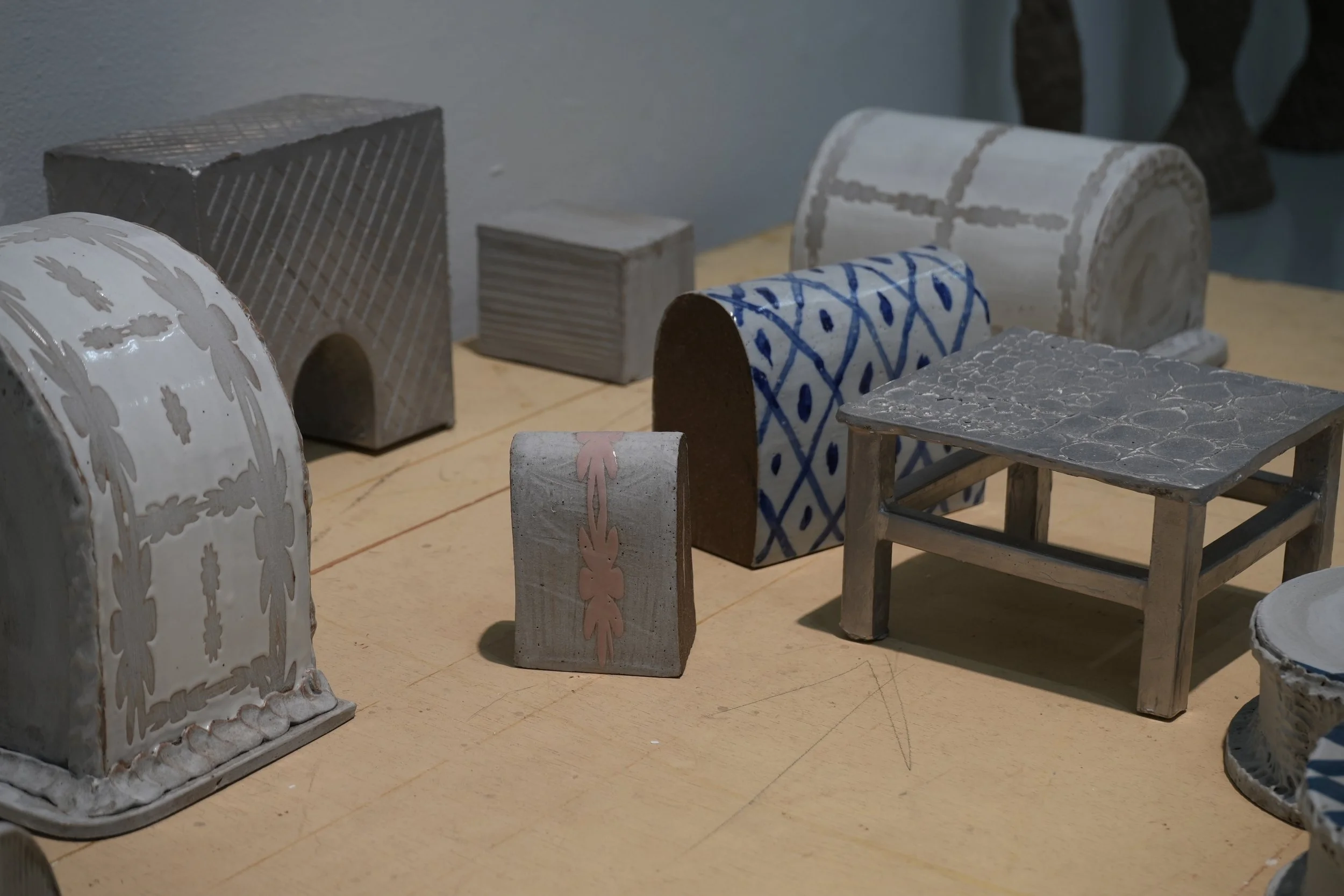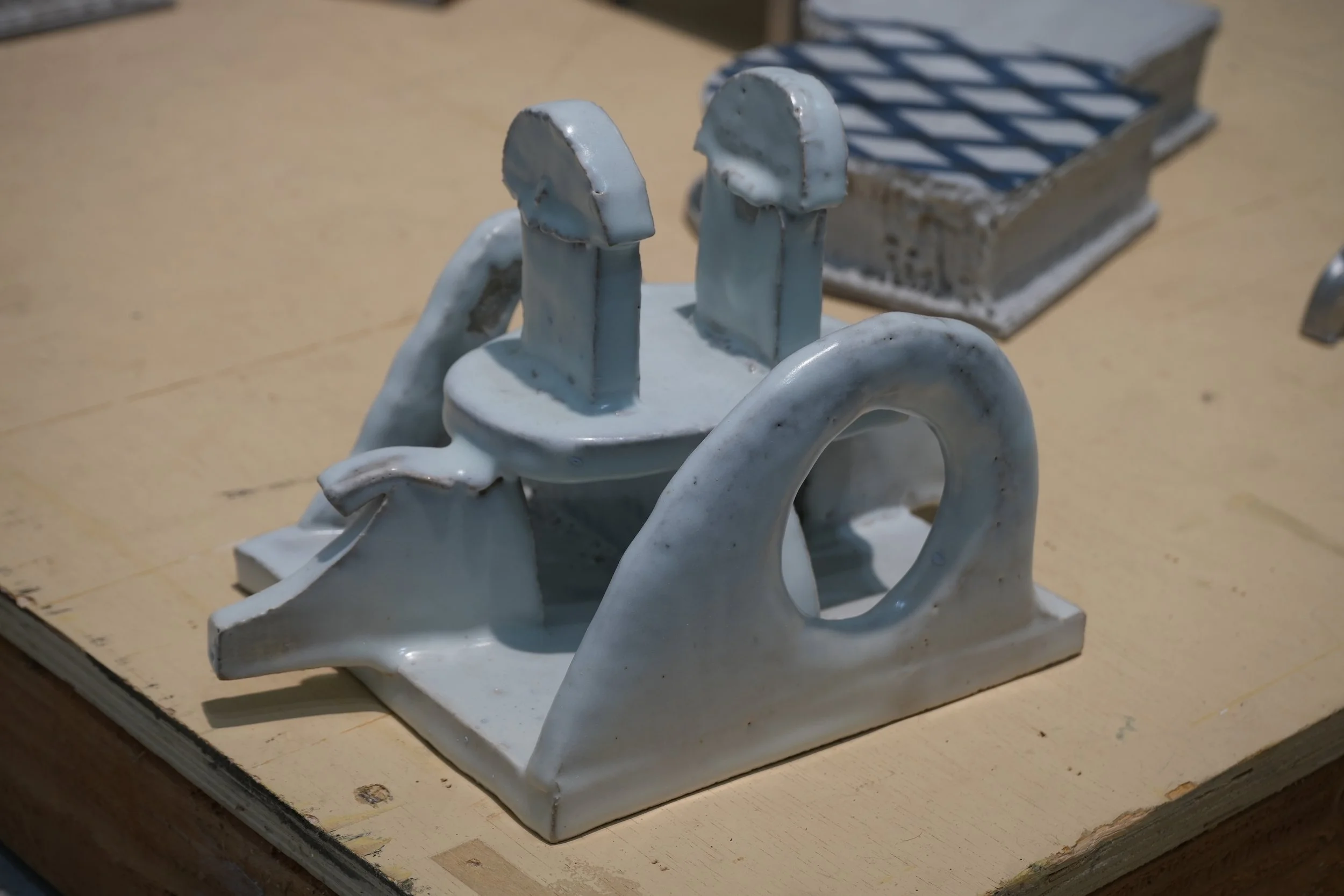 Glazed stoneware, tinted Sculptamold, wood, house paint
